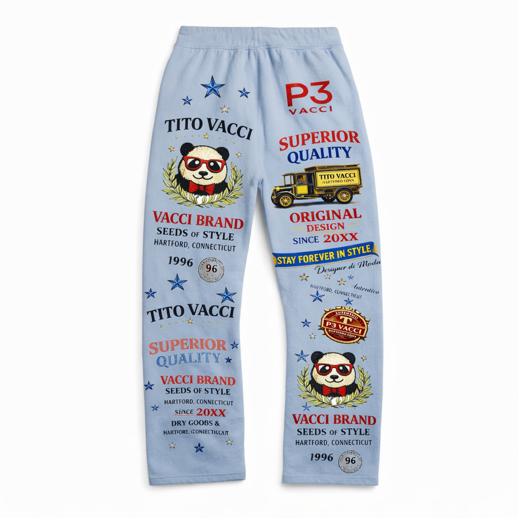 Crafted for those who refuse to blend in, these pants feature an all-over signature collage of Tito Vacci branding, including the iconic panda emblem, vintage-inspired graphics, and the unmistakable “Stay Forever In Style” slogan. Every detail is intentional — from the Hartford, Connecticut heritage marks to the premium P3 insignia — representing authenticity, culture, and confidence.